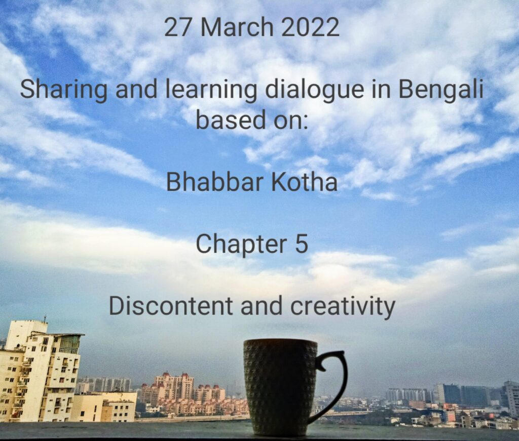 Gautam planned something different for the dialogue on 27 March. He recalled how his daily readings for his aging mother from the book ‘Bhabbar Kotha’ (Bengali translation of ‘Think on these things’) became such a transformative experience, both for himself and his mother. And so he proposed that we should read a chapter from the book and also reflect on it. The chapter selected by Gautam was chapter 5 in which J Krishnamurti talks about discontent and creativity. It was a fascinating experience as Gautam read aloud from the chapter and participants shared their own understanding.