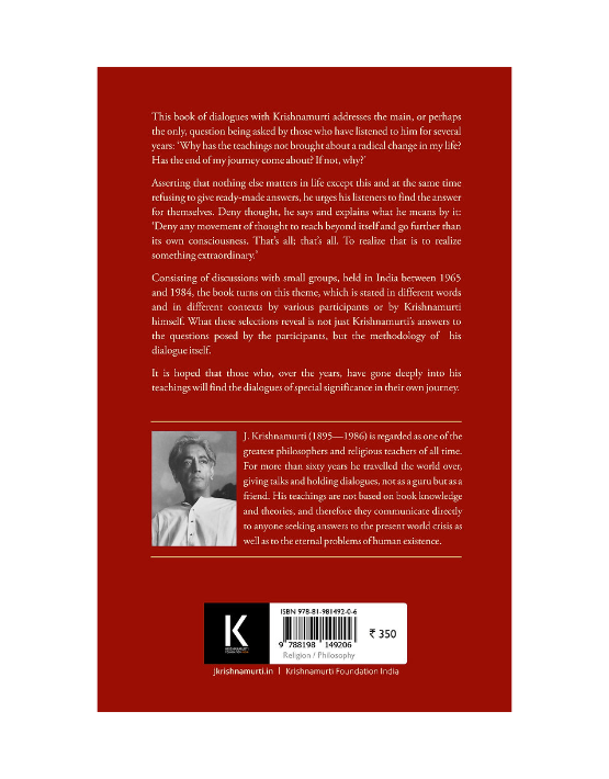 This book of dialogues with Krishnamurti addresses the main, or perhaps the only, question being asked by those who have listened to him for several years: ‘Why has the teachings not brought about a radical change in my life? Has the end of my journey come about? If not, why?’