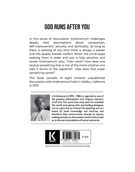 In this series of discussions, Krishnamurti challenges deeply held assumptions about comparison, self-improvement, security, and spirituality. So long as there is seeking of any kind there is always a seeker and this duality breeds conflict. When the mind stops seeking there is order and one is fully sensitive and aware. Krishnamurti asks, “Then what? How does one receive something that is not of the mind whether one calls it divine or the supreme? How does that super something come?”
