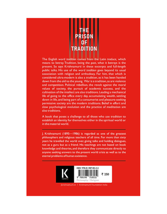 The English word tradition comes from the Latin traduce, which means to betray. Tradition, being the past, what it betrays is the present. So says Krishnamurti in these excerpts and full-length public talks. His use of the word tradition goes beyond its usual association with religion and orthodoxy. For him, that which is considered ultra-modern is also a tradition, as it has been handed down from the old to the young. War is a tradition, as are violence and competition. Political rebellion, the revolt against the moral values of society, the pursuit of academic success, and the cultivation of the intellect are also traditions. Leading a mechanical life of going to the office every day, accumulating wealth, settling down in life, and being part of a consumerist and pleasure-seeking permissive society are the modern traditions. Belief in effort and slow psychological evolution and the practice of meditation are also traditions.